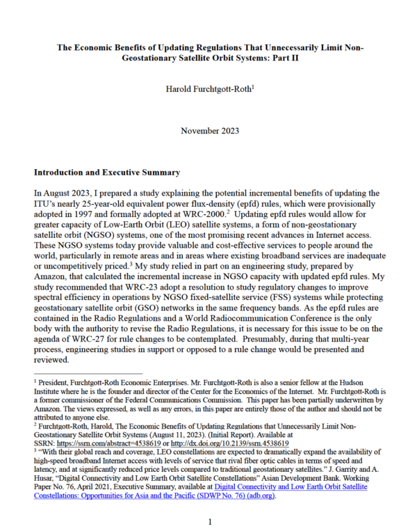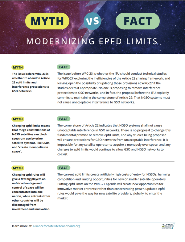 “The Alliance for Satellite Broadband is pleased with the decision at this year’s World Radio Conference to officially invite studies of epfd limits and report the results to the next WRC in 2027. This is a win for innovation, enabling ITU members to evaluate the epfd limits in light of modern satellite systems and spectrum management techniques. International regulators have taken a vital step toward revisiting these outdated rules by committing to these studies.”